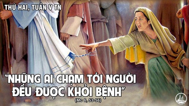 Khi ấy, Chúa Giêsu và các môn đệ qua biển rồi, các ngài tới miền Giênêsarét và ghé bến. Các ngài lên khỏi thuyền, tức thì người ta nhận ra Người, họ liền rảo chạy khắp miền, và nghe tin Người ở đâu thì khiêng những người đau yếu nằm trên chõng đến đó. Bất cứ Người vào làng trại hay đô thị nào, người ta cũng đặt các bệnh nhân ở các nơi công cộng và xin Người cho họ ít là được chạm tới gấu áo Người, và tất cả những ai chạm tới Người, đều được khỏi bệnh.