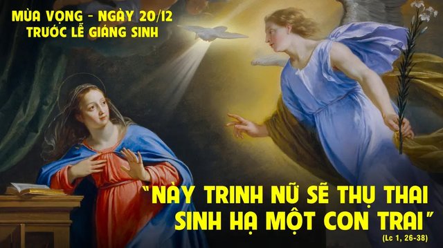 Khi ấy Thiên thần Gabriel được Chúa sai đến một thành xứ Galilêa, tên là Nadarét, đến với một trinh nữ đã đính hôn với một người tên là Giuse, thuộc chi họ Ðavít, trinh nữ ấy tên là Maria. Thiên thần vào nhà trinh nữ và chào rằng: “Kính chào Bà đầy ơn phước, Thiên Chúa ở cùng Bà. Bà được chúc phúc giữa các người phụ nữ”. Nghe lời đó, Bà bối rối và tự hỏi lời chào đó có ý nghĩa gì. Thiên thần liền thưa: “Maria đừng sợ, vì đã được nghĩa với Chúa. Này Bà sẽ thụ thai, sinh một con trai và đặt tên là Giêsu. Người sẽ nên cao trọng và được gọi là con Ðấng Tối Cao. Thiên Chúa sẽ ban cho Người ngôi báu Ðavít, tổ phụ Người. Người sẽ cai trị đời đời trong nhà Giacóp, và triều đại Người sẽ vô tận”.