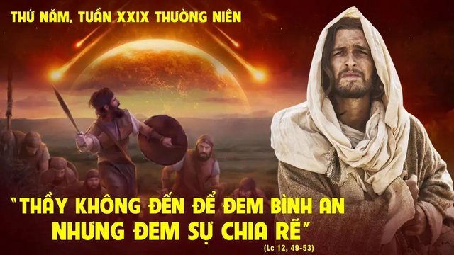 Khi ấy, Chúa Giêsu phán cùng các môn đệ rằng: “Thầy đã đến đem lửa xuống thế gian, và Thầy mong muốn biết bao cho lửa cháy lên. Thầy phải chịu một phép rửa, và lòng Thầy khắc khoải biết bao cho đến khi hoàn tất. Các con tưởng Thầy đến để đem sự bình an xuống thế gian ư? Thầy bảo các con: không phải thế, nhưng Thầy đến để đem sự chia rẽ. Vì từ nay, năm người trong một nhà sẽ chia rẽ nhau, ba người chống lại hai, và hai người chống lại ba: cha chống đối con trai, và con trai chống đối cha; mẹ chống đối con gái, và con gái chống đối mẹ; mẹ chồng chống đối nàng dâu, và nàng dâu chống đối mẹ chồng.