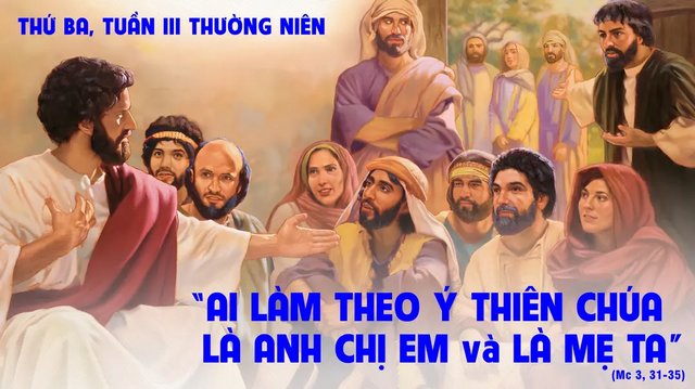 Bấy giờ có đám đông ngồi chung quanh Người và họ trình với Người rằng: “Kìa mẹ và anh em Thầy ở ngoài kia đang tìm Thầy”.Người trả lời rằng: “Ai là mẹ Ta? Ai là anh em Ta?” Rồi đưa mắt nhìn những người ngồi vòng quanh, Người nói: “Ðây là mẹ Ta và anh em Ta. Vì ai làm theo ý Thiên Chúa, thì người ấy là anh chị em và là mẹ Ta”.