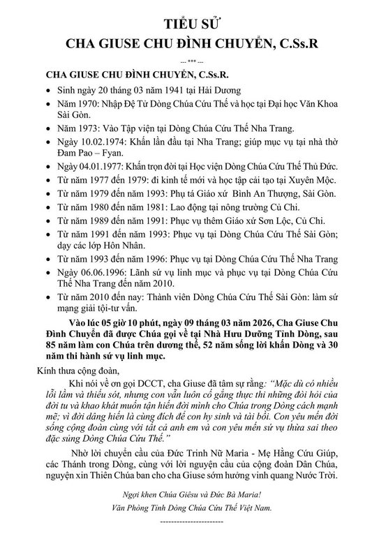 THÔNG BÁOCáo Phó : Linh Mục Giuse Chu Đình Chuyển, DCCT, Đã An Nghỉ Trong Chúa Đăng vào Tháng 3 9, 2026 bởi Nguyễn Quang Ngọc 09 Th3 Nguyễn Quang Ngọc Giáo Xứ Chí Hòa, Hạt Chí Hòa, TGP. Sài Gòn : Chương Trình, Mùa Chay Thánh 2026