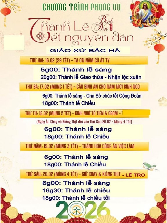THÔNG BÁOGiáo Xứ Bắc Hà, Hạt Phú Thọ, TGP. Sài Gòn : Chương Trình Phụng Vụ, Thánh Lễ Tết Bính Ngọ 2026 Đăng vào Tháng 1 29, 2026 bởi Nguyễn Quang Ngọc 29 Th1 Nguyễn Quang Ngọc Thông Báo – Dòng Anh Em Hèn Mọn, Tỉnh Dòng Thánh Phanxicô Việt Nam : Thánh lễ Khai mạc Năm Thánh Phan Sinh với ơn toàn xá Giáo Xứ Tân Dân, Hạt Chí Hòa, TGP. Sài Gòn : Chương Trình Phụng Vụ, Tết Bính Ngọ 2026