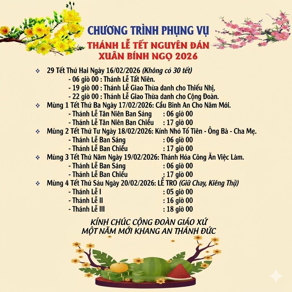 THÔNG BÁOGiáo Xứ Bạch Đằng, Hạt Hóc Môn, TGP. Sài Gòn : Chương Trình Phụng Vụ, Thánh Lễ Tết Nguyên Đán, Xuân Bính Ngọ 2026 Đăng vào Tháng 2 9, 2026 bởi Nguyễn Quang Ngọc 09 Th2 Nguyễn Quang Ngọc Xin anh chị em lưu ý: Bắt đầu từ thứ Tư 18.02.2026, Giáo Hội bước vào Mùa Chay. Vì thế, trong Thánh Lễ Mùng 2 Tết, Mùng 3 Tết KHÔNG HÁT HOẶC ĐỌC ALLELUIA TRONG CÁC CỬ HÀNH PHỤNG VỤ Giáo Xứ Ninh Phát, Hạt Tân Sơn Nhì, TGP. Sài Gòn : Lịch Mục Vụ Tết 2026