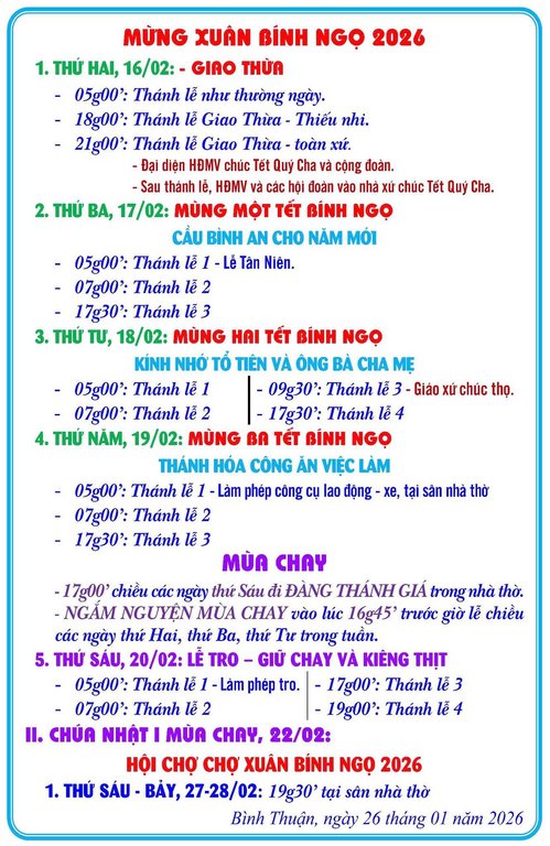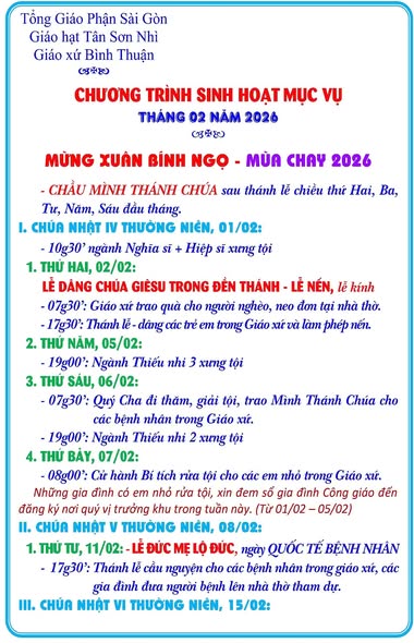 THÔNG BÁOGiáo Xứ Bình Thuận, Hạt Tân Sơn Nhì, TGP. Sài Gòn : Chương Trình Sinh Hoạt Mục Vụ, Tháng 02 Năm 2026, Mừng Tết Nguyên Đán Bính Ngọ Đăng vào Tháng 2 5, 2026 bởi Nguyễn Quang Ngọc 05 Th2 Nguyễn Quang Ngọc Giáo Xứ Bình Hưng, Hạt Bình An, TGP. Sài Gòn : Chương Trình Thánh Lễ, Xuân Bính Ngọ 2026 Giáo Xứ Bà Điểm, Hạt Hóc Môn, TGP. Sài Gòn : Chương Trình Lễ Tết Nguyên Đán, Xuân Bính Ngọ 2026