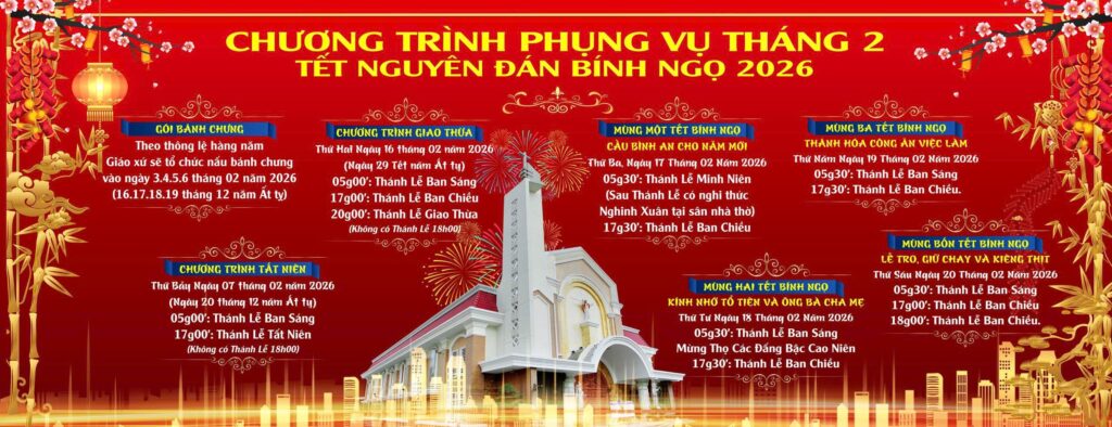 THÔNG BÁOGiáo Xứ Bùi Phát, Hạt Tân Định, TGP. Sài Gòn : Chương Trình Phụng Vụ Tháng 2, Tết Nguyên Đán Bính Ngọ 2026 Đăng vào Tháng 2 9, 2026 bởi Nguyễn Quang Ngọc 09 Th2 Nguyễn Quang Ngọc Giáo Xứ Phú Hạnh, Hạt Phú Nhuận, TGP. Sài Gòn : Chương Trình Phụng Vụ, Tết Bính Ngọ 2026 Xin anh chị em lưu ý: Bắt đầu từ thứ Tư 18.02.2026, Giáo Hội bước vào Mùa Chay. Vì thế, trong Thánh Lễ Mùng 2 Tết, Mùng 3 Tết KHÔNG HÁT HOẶC ĐỌC ALLELUIA TRONG CÁC CỬ HÀNH PHỤNG VỤ