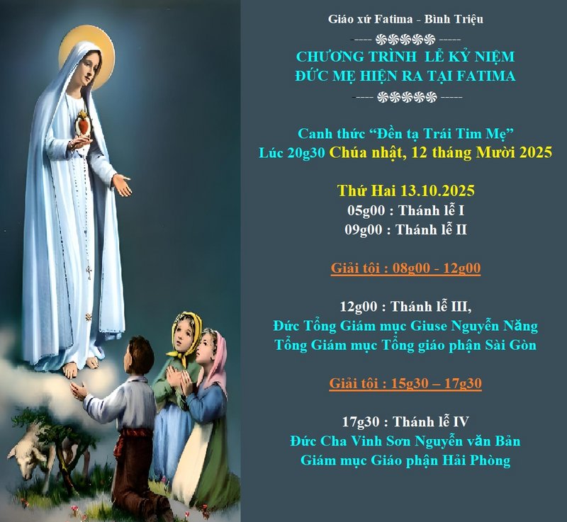 THÔNG BÁOGiáo Xứ Fatima – Bình Triệu, Hạt Thủ Đức, TGP. Sài Gòn : Chương Trình Lễ Kỷ Niệm, Đức Mẹ Hiện Ra Tại Fatima (13.10.2025) Đăng vào Tháng 10 11, 2025 bởi Nguyễn Quang Ngọc 11 Th10 Nguyễn Quang Ngọc (13/10/2025 – THỨ HAI TUẦN 28 THƯỜNG NIÊN) TÌM KIẾM DẤU LẠ (14/10/2025 – THỨ BA TUẦN 28 THƯỜNG NIÊN) BÊN NGOÀI, BÊN TRONG