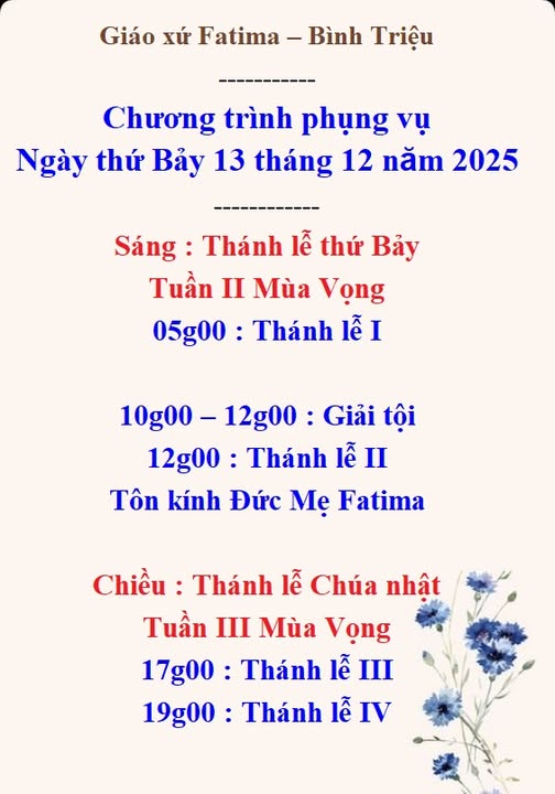 THÔNG BÁOGiáo Xứ Fatima – Bình Triệu, Hạt Thủ Đức, TGP. Sài Gòn : Chương Trình Phụng Vụ, Ngày thứ Bảy 13 tháng 12 năm 2025 Đăng vào Tháng 12 12, 2025Tháng 12 12, 2025 bởi Nguyễn Quang Ngọc 12 Th12 Nguyễn Quang Ngọc Đức Thánh Cha kêu gọi canh tân sứ mạng giáo dục và khơi dậy hy vọng nơi người trẻ châu Phi Lịch Giải Tội Mùa Vọng 2025, Giáo Hạt Xóm Mới