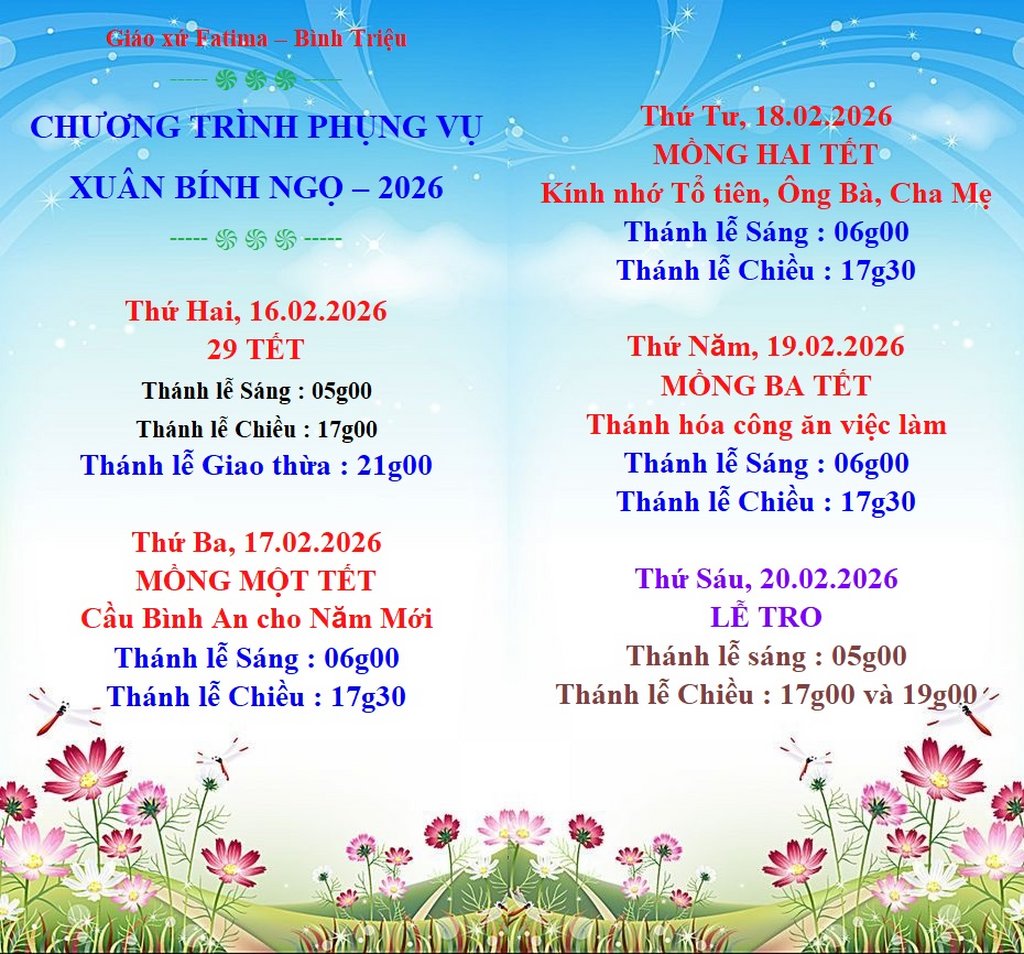THÔNG BÁOGiáo Xứ Fatima – Bình Triệu, Hạt Thủ Đức, TGP. Sài Gòn : Chương Trình Phụng Vụ, Xuân Bính Ngọ – 2026 Đăng vào Tháng 1 26, 2026 bởi Nguyễn Quang Ngọc 26 Th1 Nguyễn Quang Ngọc (28/01/2026 – THỨ TƯ TUẦN 3 THƯỜNG NIÊN) HẠT GIỐNG (29/01/2026 – THỨ NĂM TUẦN 3 THƯỜNG NIÊN) ĐẶT TRÊN ĐẾ