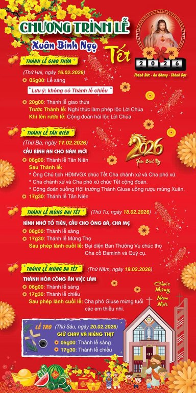 THÔNG BÁOGiáo Xứ Hà Nội, Hạt Xóm Mới, TGP. Sài Gòn : Chương Trình Lễ, Xuân Bính Ngọ 2026 Đăng vào Tháng 1 30, 2026 bởi Nguyễn Quang Ngọc 30 Th1 Nguyễn Quang Ngọc Thông tin chuẩn bị Thánh lễ tuyên Chân phước linh mục Phanxicô Trương Bửu Diệp Giáo Xứ Nghĩa Hòa, Hạt Chí Hòa, TGP. Sài Gòn : Chương Trình Phụng Vụ, Tết Bính Ngọ 2026