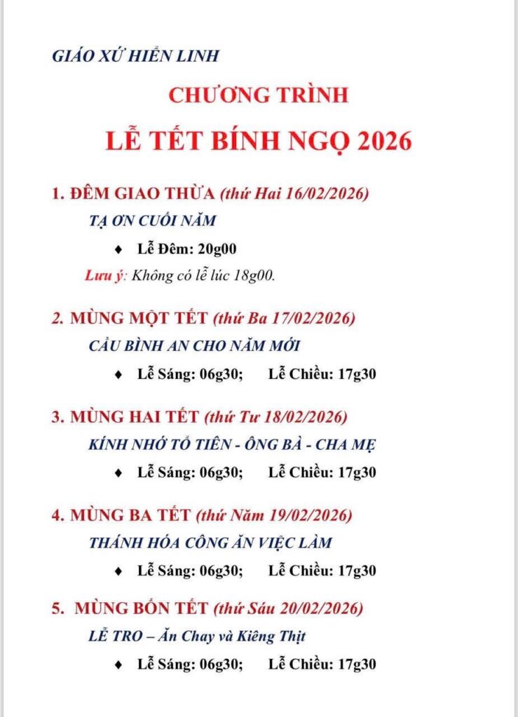 THÔNG BÁOGiáo Xứ Hiển Linh, Hạt Thủ Đức, TGP. Sài Gòn : Chương Trình, Lễ Tết Bính Ngọ 2026 Đăng vào Tháng 2 16, 2026 bởi Nguyễn Quang Ngọc 16 Th2 Nguyễn Quang Ngọc Giáo Xứ Bình Phước , Hạt Sài Gòn – Chợ Quán, TGP. Sài Gòn : Các Thánh Lễ, Mừng Xuân Bính Ngọ – 2026 Giáo Xứ Tam Hà, Hạt Thủ Đức, TGP. Sài Gòn : Chương Trình Tất Niên và Tết Nguyên Đán Bính Ngọ 2026