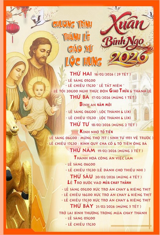 THÔNG BÁOGiáo Xứ Lộc Hưng, Hạt Chí Hòa, TGP. Sài Gòn : Chương Trình Thánh Lễ, Xuân Bính Ngọ 2026 Đăng vào Tháng 2 13, 2026 bởi Nguyễn Quang Ngọc 13 Th2 Nguyễn Quang Ngọc Giáo Xứ Bình Đông, Hạt Bình An, TGP. Sài Gòn : Giờ Lễ, Những Ngày Tết Nguyên Đán 2026 và Lễ Tro Giáo Xứ Nam Hòa, Hạt Chí Hòa, TGP. Sài Gòn : Lịch Sinh Hoạt và Phụng Vụ Xuân Bính Ngọ 2026