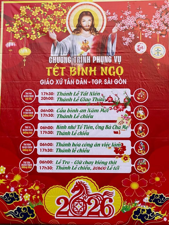 THÔNG BÁOGiáo Xứ Tân Dân, Hạt Chí Hòa, TGP. Sài Gòn : Chương Trình Phụng Vụ, Tết Bính Ngọ 2026 Đăng vào Tháng 1 29, 2026 bởi Nguyễn Quang Ngọc 29 Th1 Nguyễn Quang Ngọc Giáo Xứ Bắc Hà, Hạt Phú Thọ, TGP. Sài Gòn : Chương Trình Phụng Vụ, Thánh Lễ Tết Bính Ngọ 2026 Thông Báo : Giáo Xứ Thánh Đaminh – Ba Chuông, Hạt Phú Nhuận, TGP. Sài Gòn : Chương Trình Xuân Yêu Thương, lần thứ 12 (19g00, thứ sáu ngày 06/02/2026 nhằm 19 Tết)