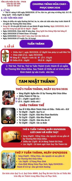 THÔNG BÁOGiáo Xứ Tân Quy, Hạt Hóc Môn, TGP. Sài Gòn : Chương Trình Mùa Chay, Phục Sinh 2026 Đăng vào Tháng 3 20, 2026 bởi Nguyễn Quang Ngọc 20 Th3 Nguyễn Quang Ngọc SUY NIỆM PHÚC ÂM, CHÚA NHẬT V MÙA CHAY NĂM A (22/03/2026) KHÔNG GÌ QUÝ HƠN SỰ SỐNG VÀ SỰ SỐNG LẠI Giáo Xứ Tân Hiệp, Hạt Hóc Môn, TGP. Sài Gòn : Chương Trình, Phụng Vụ Tuần Thánh Và Phục Sinh 2026