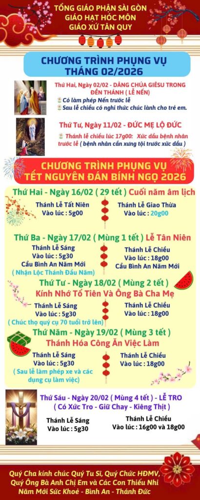 THÔNG BÁOGiáo Xứ Tân Quy, Hạt Hóc Môn, TGP. Sài Gòn : Chương Trình Phụng Vụ, Tết Nguyên Đán Bính Ngọ 2026 Đăng vào Tháng 2 14, 2026 bởi Nguyễn Quang Ngọc 14 Th2 Nguyễn Quang Ngọc Giáo Xứ Tân Mỹ, Hạt Hóc Môn, TGP. Sài Gòn : Chương Trình Phụng Vụ, Xuân Bính Ngọ – 2026 Giáo Xứ Tân Thịnh, Hạt Hóc Môn, TGP. Sài Gòn : Chương Trình Phụng Vụ, Mừng Xuân Bính Ngọ – 2026