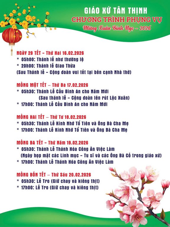 THÔNG BÁOGiáo Xứ Tân Thịnh, Hạt Hóc Môn, TGP. Sài Gòn : Chương Trình Phụng Vụ, Mừng Xuân Bính Ngọ – 2026 Đăng vào Tháng 2 14, 2026 bởi Nguyễn Quang Ngọc 14 Th2 Nguyễn Quang Ngọc Giáo Xứ Tân Quy, Hạt Hóc Môn, TGP. Sài Gòn : Chương Trình Phụng Vụ, Tết Nguyên Đán Bính Ngọ 2026 Giáo Xứ Trung Chánh, Hạt Hóc Môn, TGP. Sài Gòn : Chương Trình, Thánh Lễ Mừng Xuân, Bính Ngọ 2026 & Thứ Sáu Lễ Tro