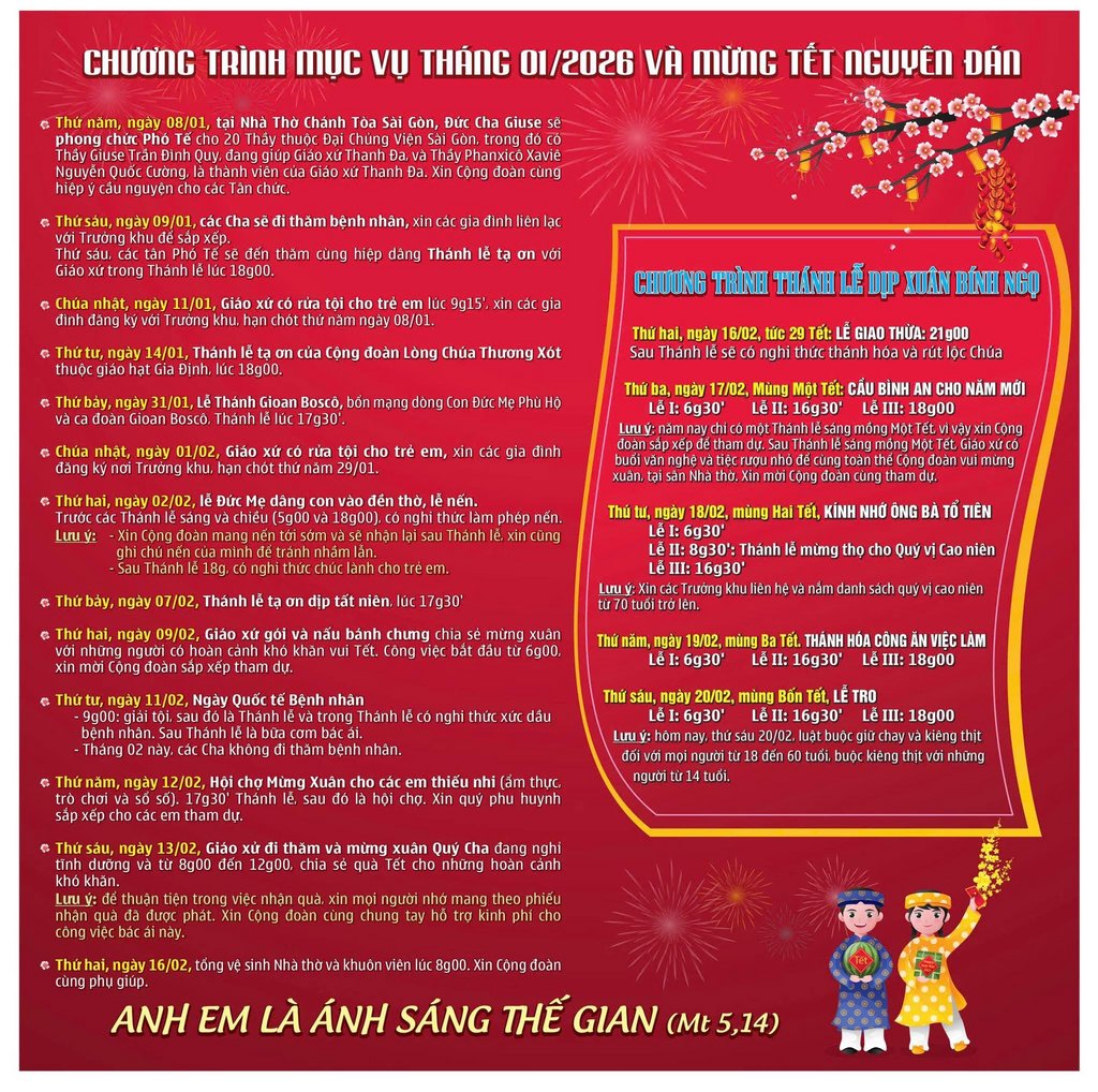 Giáo Xứ Thanh Đa, Hạt Gia Định, TGP. Sài Gòn : Chương Trình Mục Vụ Tháng 01/2026 Và Mừng Tết Nguyên Đán 2026