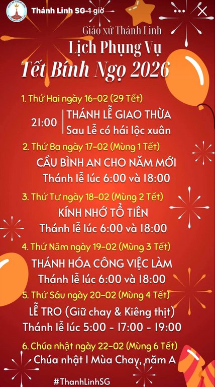 THÔNG BÁOGiáo Xứ Thánh Linh, Hạt Thủ Thiêm, TGP. Sài Gòn : Lịch Phụng Vụ, Tết Bính Ngọ 2026 Đăng vào Tháng 2 5, 2026 bởi Nguyễn Quang Ngọc 05 Th2 Nguyễn Quang Ngọc Giáo Xứ Sao Mai, Hạt Chí Hòa, TGP. Sài Gòn : Thánh Lễ Cung Hiến Thánh Đường và Thánh Hiến Bàn Thờ (9h00 Thứ tư Ngày 04.02.2026) Giáo Xứ Tân Hiệp, Hạt Hóc Môn, TGP. Sài Gòn : Lịch Phụng Vụ, Tết Bính Ngọ 2026