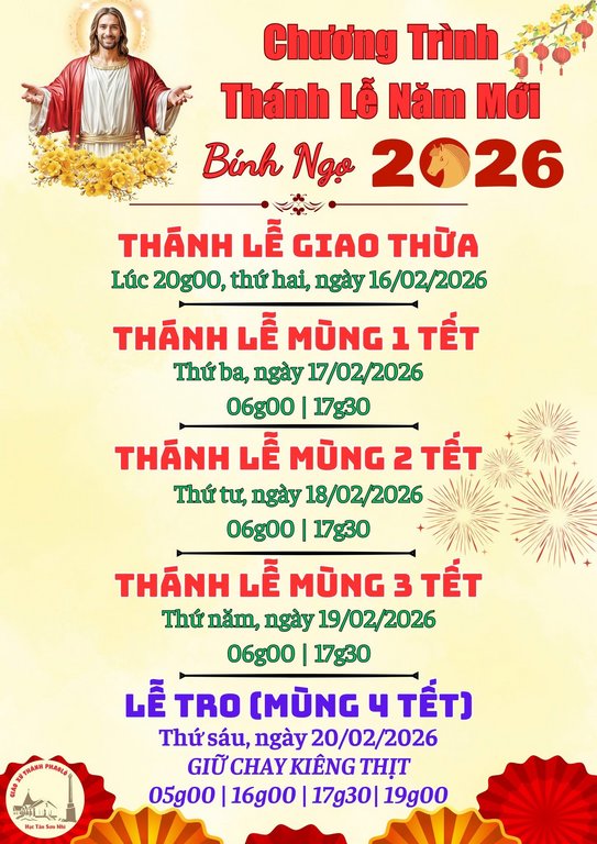 THÔNG BÁOGiáo Xứ Thánh Phaolô, Hạt Tân Sơn Nhì, TGP. Sài Gòn : Chương Trình , Thánh Lễ Năm Mới Bính Ngọ 2026 Đăng vào Tháng 2 6, 2026 bởi Nguyễn Quang Ngọc 06 Th2 Nguyễn Quang Ngọc ĐTC Lêô XIV: Đào tạo Kitô giáo là “sinh thành” trong đức tin và đời sống cộng đoàn Giáo Xứ Mẫu Tâm, Hạt Xóm Chiếu, TGP. Sài Gòn : Chương Trình Lễ Tết Nguyên Đán, Mừng Năm Mới Bính Ngọ 2026