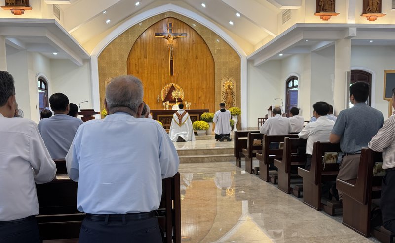 Đúng 8g, các linh mục đã vào nhà nguyện lầu hai của Đại chủng viện Thánh Giuse để lần hạt Mân côi chung với nhau, rồi cùng nhau lắng nghe Đức Giám mục phụ tá Giuse Bùi Công Trác giảng về đề tài “Sự thánh thiện cần có của các linh mục thừa sai”.