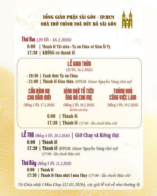 THÔNG BÁONhà Thờ Chính Tòa Đức Bà Sài Gòn : Chương Trình, Thánh Lễ trong tuần Tết Bính Ngọ và Lễ Tro năm 2026 Đăng vào Tháng 1 30, 2026 bởi Nguyễn Quang Ngọc 30 Th1 Nguyễn Quang Ngọc ĐTC Lêô XIV: Ước mong dịp kỷ niệm 800 năm Nhà thờ Chính tòa Toledo là thời gian ân sủng Giáo Xứ Đức Mẹ Hằng Cứu Giúp, Hạt Tân Định, TGP. Sài Gòn : Chương Trình, Hành Hương Minh Niên, Xuân Bính Ngọ 2026