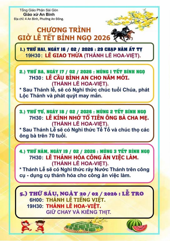 THÔNG BÁONhà Thờ Thánh Giuse – Giáo Xứ An Bình, Hạt Sài Gòn-Chợ Quán, TGP. Sài Gòn : Chương Trình, Giờ Lễ Tết Bính Ngọ 2026 Đăng vào Tháng 2 9, 2026 bởi Nguyễn Quang Ngọc 09 Th2 Nguyễn Quang Ngọc Giáo Xứ Chợ Quán, Hạt Sài Gòn – Chợ Quán, TGP. Sài Gòn : Giờ Lễ Tết Nguyên Đán, Bính Ngọ 2026 Giáo Xứ Bình An, Hạt Bình An, TGP. Sài Gòn : Chương Trình Phụng Vụ, Tết Nguyên Đán Bính Ngọ 2026