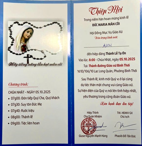 THÔNG BÁOThiệp Mời : Thánh Lễ Tạ Ơn, Mừng Lễ Đức Maria Mân Côi, Bổn Mạng Giáo Xứ Bình Thới Hạt Phú Thọ TGP. Sài Gòn Đăng vào Tháng 10 4, 2025 bởi Nguyễn Quang Ngọc 04 Th10 Nguyễn Quang Ngọc Đức Thánh Cha ký Tông huấn “Dilexi te”, tông huấn đầu tiên của ngài (05/10/2025 – CHÚA NHẬT KÍNH TRỌNG THỂ LỄ ĐỨC MẸ MÂN CÔI) ĐỨC CHÚA Ở CÙNG BÀ