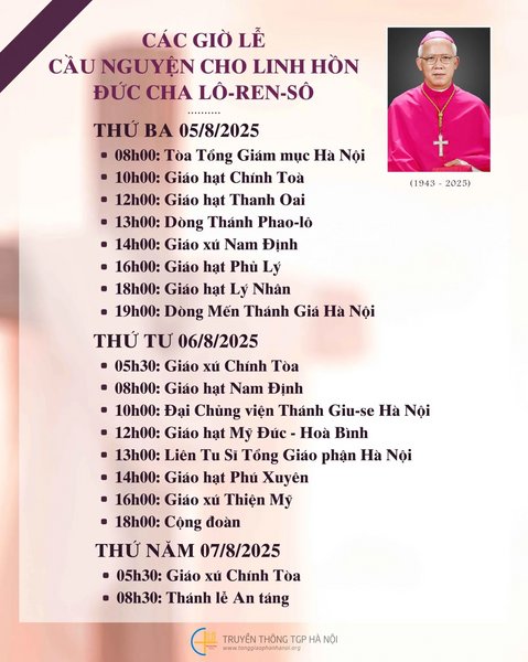 THÔNG BÁOThông báo: Các giờ lễ cầu nguyện cho Đức cha Lô-ren-sô tại nhà thờ Chính Tòa Hà Nội Đăng vào Tháng 8 6, 2025 bởi Nguyễn Quang Ngọc 06 Th8 Nguyễn Quang Ngọc Nghi thức tẫn liệm và Thánh lễ đưa chân Đức Giám mục Lô-ren-sô Chu Văn Minh (08/8/2025 – THỨ SÁU TUẦN 18 THƯỜNG NIÊN) TỪ BỎ CHÍNH MÌNH