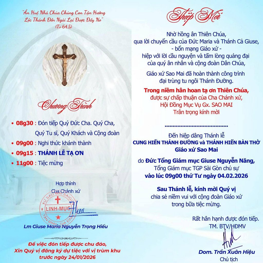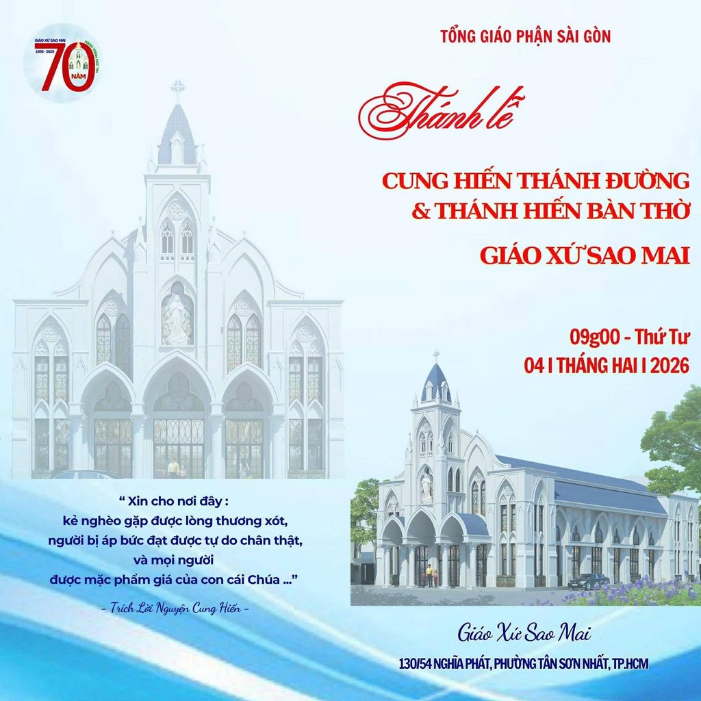 THÔNG BÁOThông Báo – Giáo Xứ Sao Mai, Hạt Chí Hòa, TGP. Sài Gòn : Thánh Lễ Cung Hiến Thánh Đường và Thánh Hiến Bàn Thờ (9h00 Thứ tư Ngày 04.02.2026) Đăng vào Tháng 2 4, 2026 bởi Nguyễn Quang Ngọc 04 Th2 Nguyễn Quang Ngọc Giáo Xứ Tân Thái Sơn, Hạt Tân Sơn Nhì, TGP. Sài Gòn : Chương Trình, Phụng Vụ Tết Bính Ngọ 2026 (05/02/2026 – THỨ NĂM TUẦN 4 THƯỜNG NIÊN) KHÔNG ĐƯỢC MANG GÌ