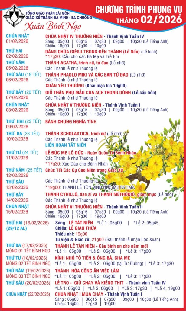 Thông Báo : Giáo Xứ Thánh Đaminh – Ba Chuông, Hạt Phú Nhuận, TGP. Sài Gòn : Chương Trình Phụng Vụ Tháng 02/2026 Xuân Bính Ngọ