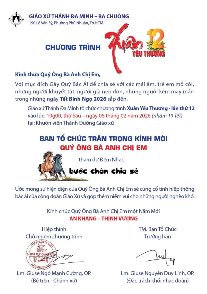 THÔNG BÁOThông Báo : Giáo Xứ Thánh Đaminh – Ba Chuông, Hạt Phú Nhuận, TGP. Sài Gòn : Chương Trình Xuân Yêu Thương, lần thứ 12 (19g00, thứ sáu ngày 06/02/2026 nhằm 19 Tết) Đăng vào Tháng 1 29, 2026 bởi Nguyễn Quang Ngọc 29 Th1 Nguyễn Quang Ngọc Giáo Xứ Tân Dân, Hạt Chí Hòa, TGP. Sài Gòn : Chương Trình Phụng Vụ, Tết Bính Ngọ 2026 Thông Báo : Giáo Xứ Thánh Đaminh – Ba Chuông, Hạt Phú Nhuận, TGP. Sài Gòn : Chương Trình Phụng Vụ Tháng 02/2026 Xuân Bính Ngọ