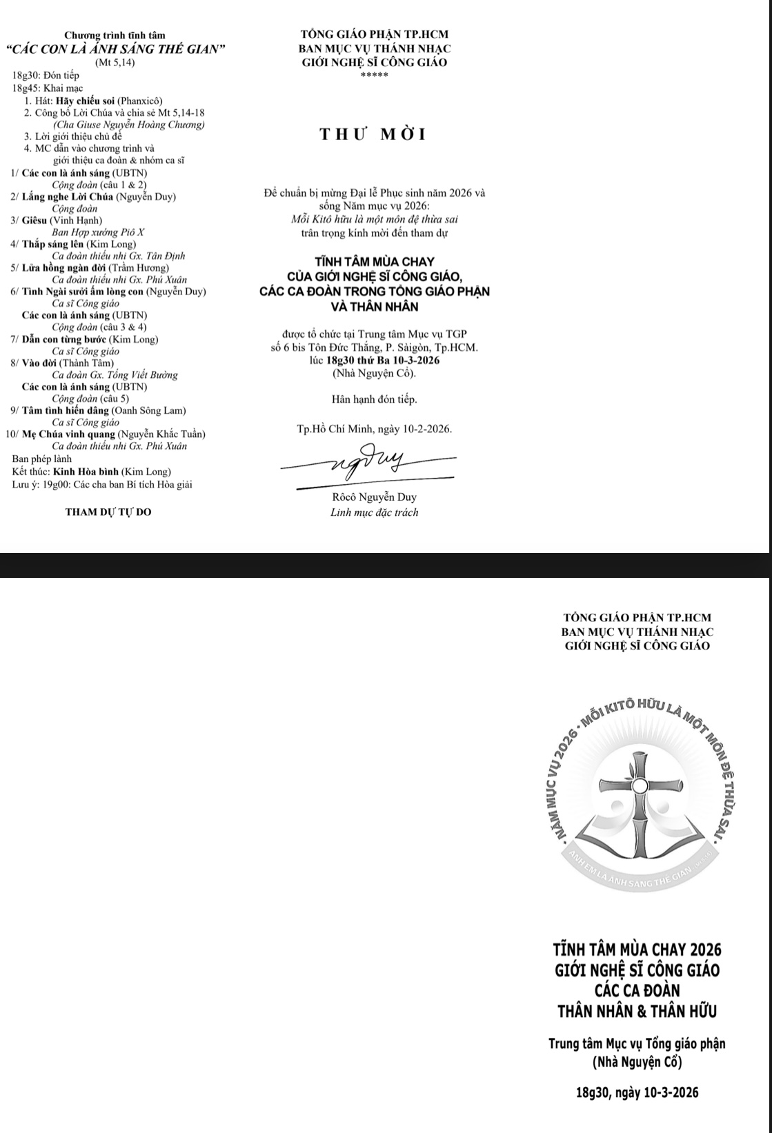 THÔNG BÁOThư mời Giới Nghệ sĩ Công giáo và các ca đoàn Tĩnh tâm Đăng vào Tháng 3 5, 2026 bởi Nguyễn Quang Ngọc 05 Th3 Nguyễn Quang Ngọc Đức Thánh Cha nhận thiết bị y tế tiên tiến phục vụ chăm sóc sức khỏe trẻ em Giáo Xứ Vinh Sơn – Nghĩa Hòa, Hạt Chí Hòa, TGP. Sài Gòn : Chương Trình Mùa Chay, Tuần Thánh Và Đại Lễ Phục Sinh 2026