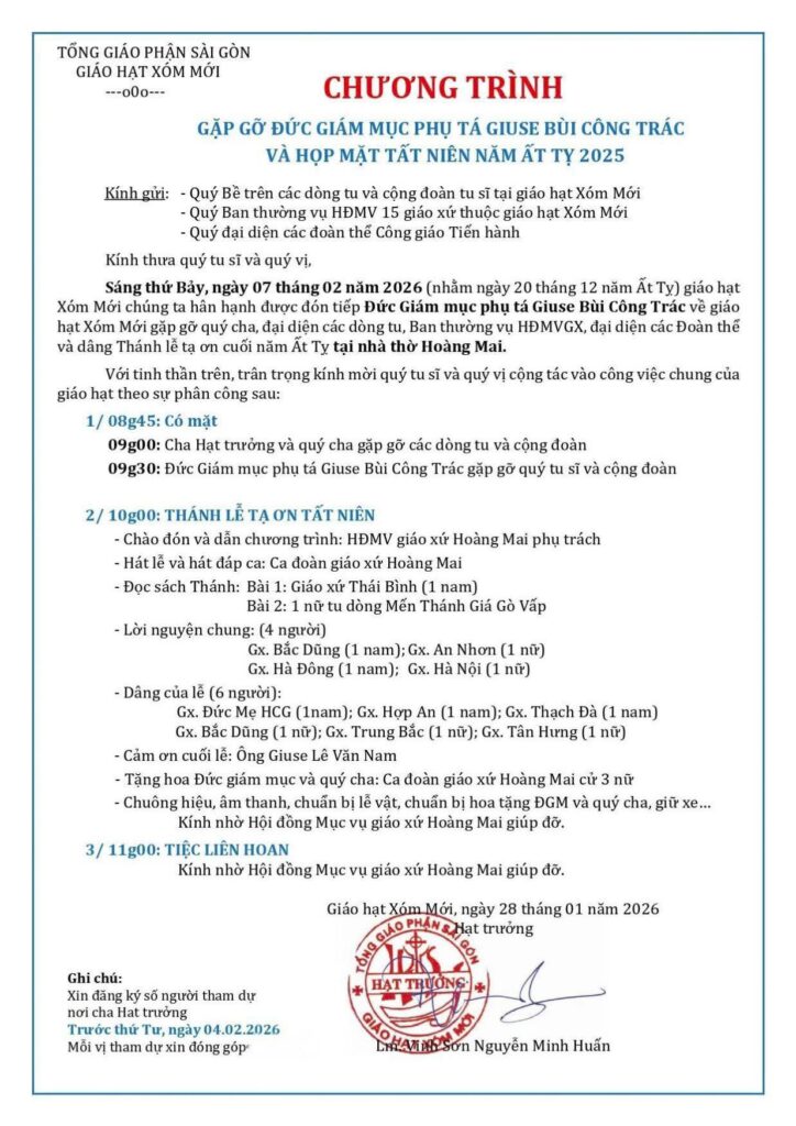 THÔNG BÁOTổng Giáo Phận Sài Gòn, Giáo Hạt Xóm Mới : Chương Trình, Gặp Gỡ Đức Giám Mục Phụ Tá Giuse Bùi Công Trác và Họp Mặt Tất Niên Năm Ất Tỵ 2025 Đăng vào Tháng 1 30, 2026Tháng 1 30, 2026 bởi Nguyễn Quang Ngọc 30 Th1 Nguyễn Quang Ngọc Giáo Xứ Đức Mẹ Hằng Cứu Giúp, Hạt Tân Định, TGP. Sài Gòn : Chương Trình, Hành Hương Minh Niên, Xuân Bính Ngọ 2026 Thông tin chuẩn bị Thánh lễ tuyên Chân phước linh mục Phanxicô Trương Bửu Diệp