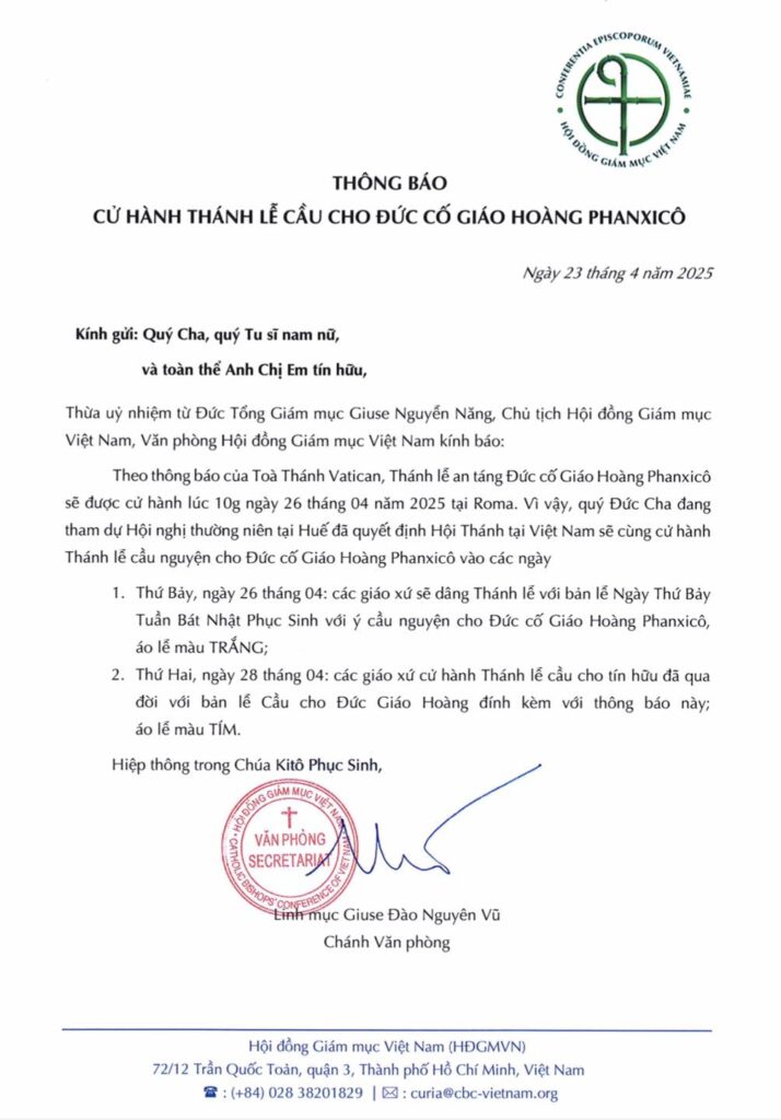 THÔNG BÁOVĂN PHÒNG HỘI ĐỒNG GIÁM MỤC VIỆT NAM THÔNG BÁO CỬ HÀNH THÁNH LỄ CẦU CHO ĐỨC CỐ GIÁO HOÀNG PHANXICÔ Đăng vào Tháng 4 23, 2025 bởi Nguyễn Quang Ngọc 23 Th4 Nguyễn Quang Ngọc HỘI NGHỊ THƯỜNG NIÊN KỲ I/2025: NGÀY 23 THÁNG 4 ĐTC Phanxicô, người con của công đồng Vatican II
